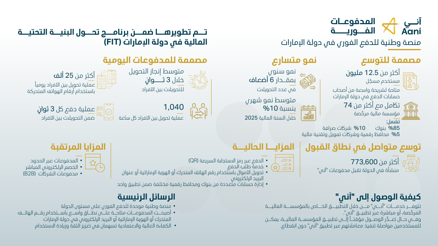 وامتدت إنجازات "آني" لتشمل قطاعاً واسعاً من الأعمال، حيث اعتمدت حوالي 774 ألف منشأة تجارية في الدولة المنصة كحل أساسي للدفع. وتتيح المنصة للشركات بمختلف أحجامها تنفيذ وتسوية المعاملات المالية بين الحسابات بشكل فوري، بمتوسط زمن إنجاز قياسي لا يتجاوز ثلاث ثوانٍ، مما يسهم في تعزيز التدفقات النقدية ورفع الكفاءة التشغيلية للمؤسسات.