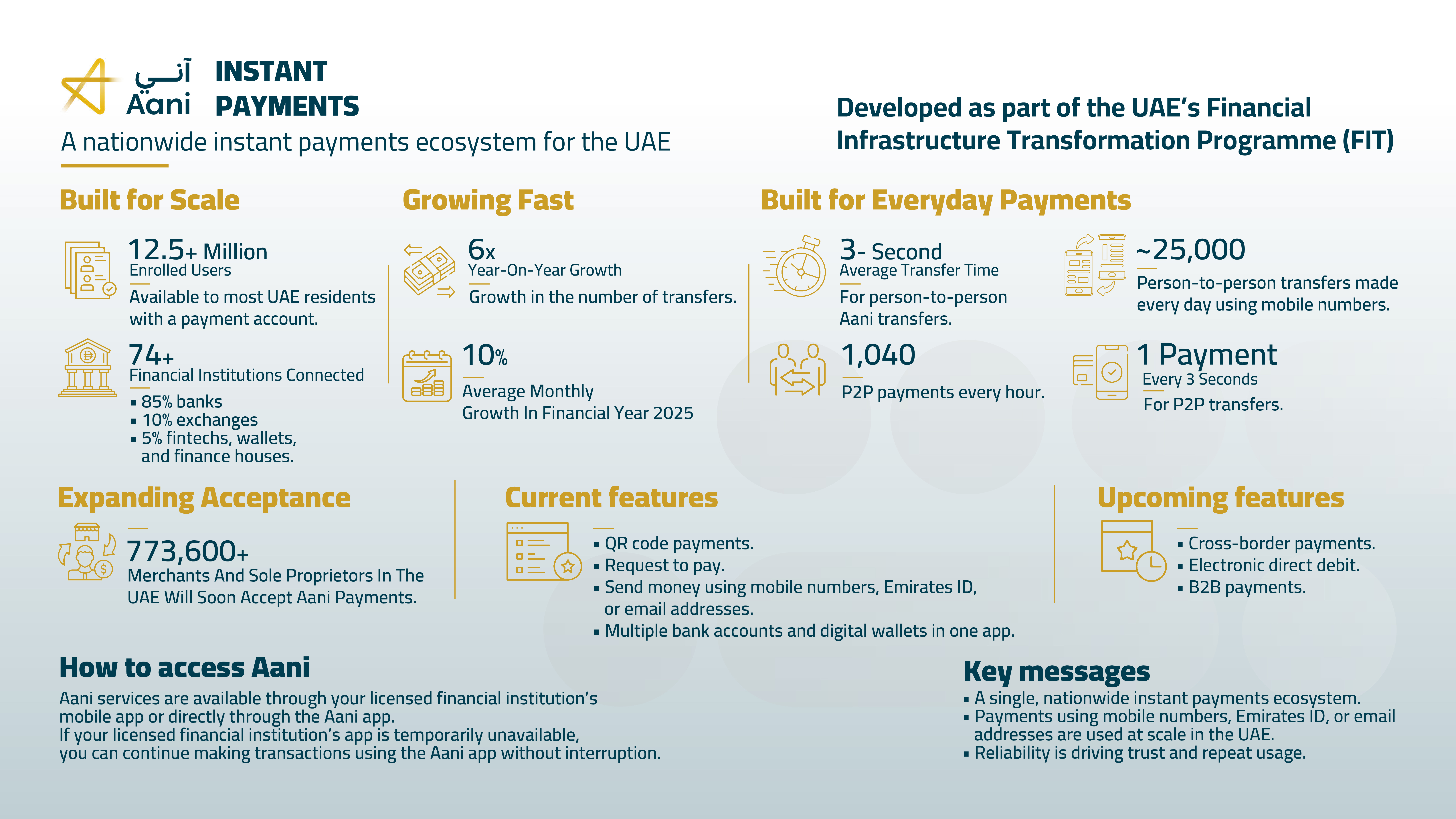 Aani’s achievements have also extended across a wide range of businesses, with approximately 774,000 merchants across the UAE adopting the platform as a primary payment solution. The platform enables businesses of all sizes to execute and settle account-to-account transactions instantly, with an average completion time of no more than three seconds, contributing to stronger cash flows and enhanced operational efficiency for enterprises.